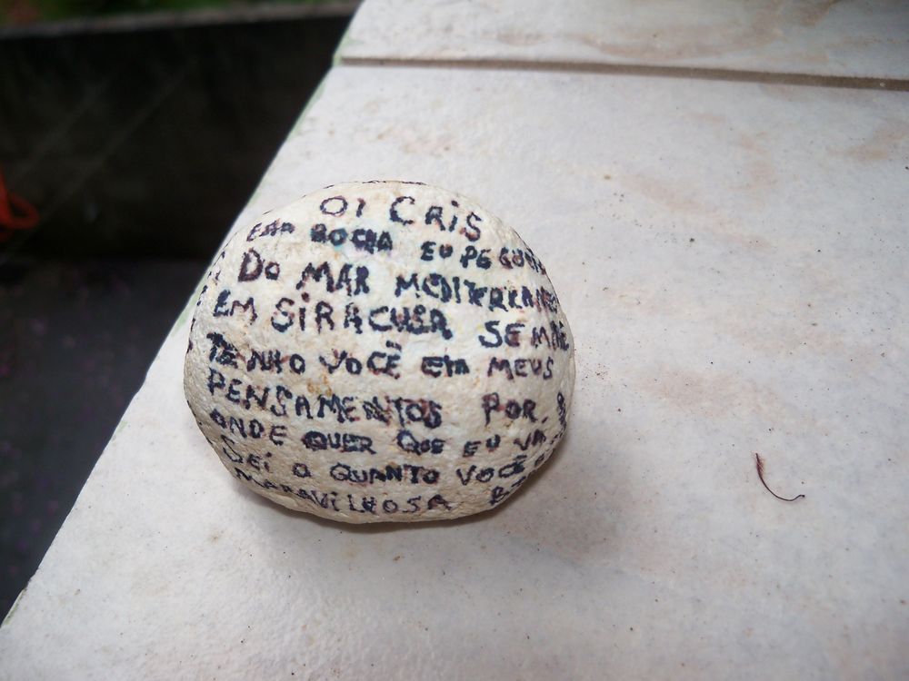 Era mais um jeito de ficarmos proximos. E ficamos mesmo. O dia inteiro a internet ligada. Eu o via o dia todo. E ele me via tambem. Alem disso, agora as cartas iam daqui para là e de là para cà tambem. No meu aniversario eu ganhei pedras da Sicilia com frases lindas.
